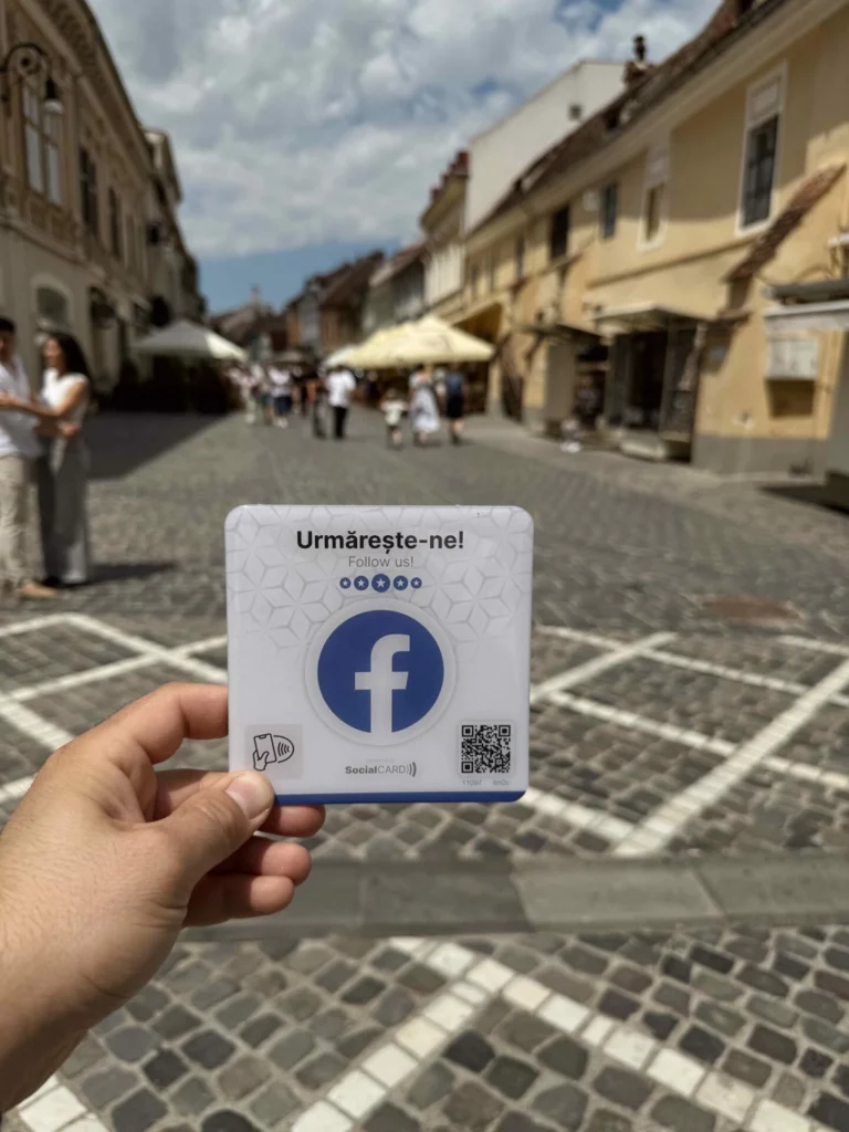 Am lipit sticker-ul Facebook la intrarea în magazin. Modern, simplu și atrage imediat atenția clienților. Un singur gest și deja ne urmăresc!