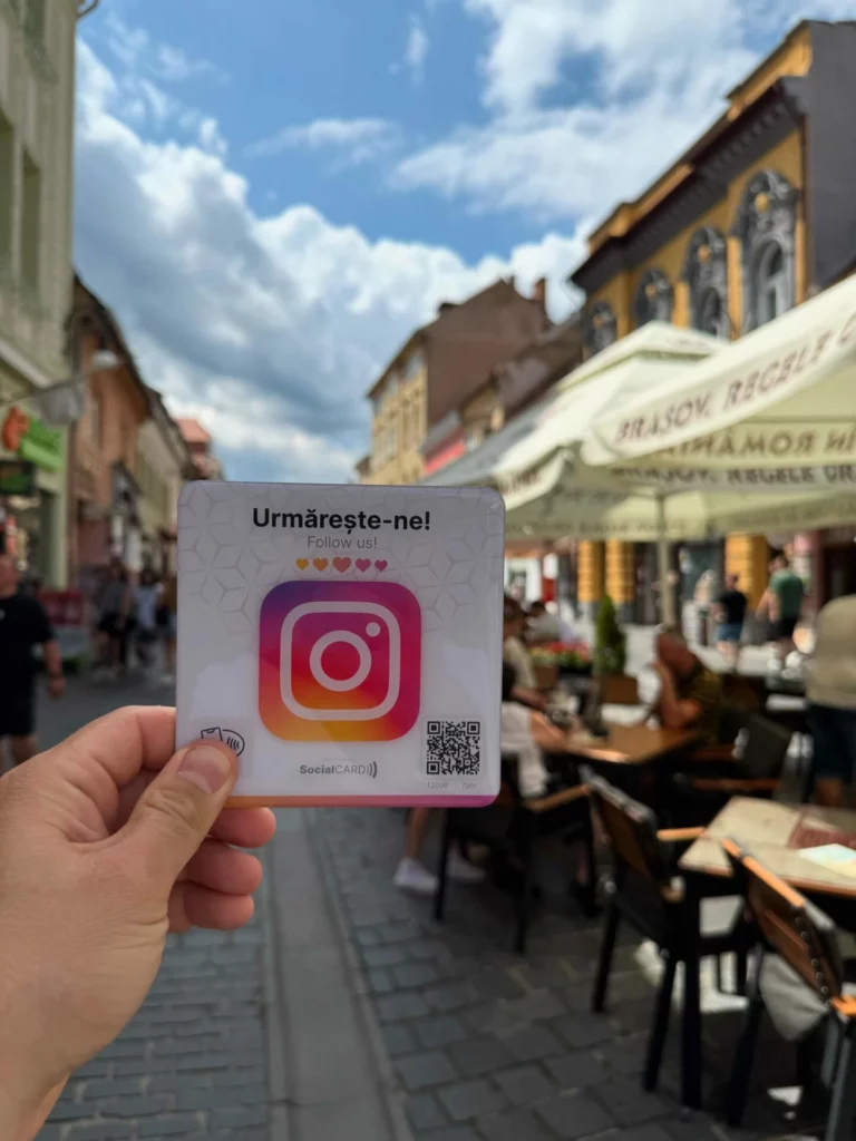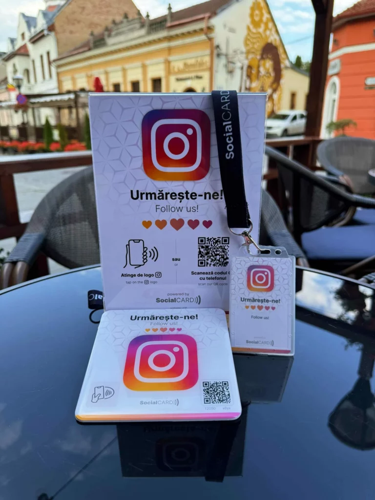Eticheta inteligentă cu dimensiuni de 12 cm x 12 cm, cu copertă dură, pentru colectarea urmăritorilor pe Instagram. Este impermeabilă, rezistentă la rupere și nu poate fi răsturnată de pe masă. Funcționează cu orice telefon, fără a necesita aplicație.