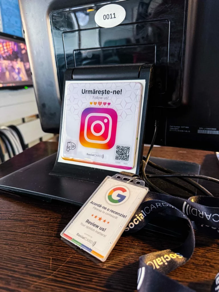 Mai multe companii vând carduri de colectare a evaluărilor Google. SocialCard se diferențiază prin faptul că funcționează fără aplicație, este livrat activat direct la tine și include gratuit un software accesibil din browser pentru urmărirea numărului de scanări. În plus, pe partea din spate a cardului găsești un cod QR pe care îl poți scana cu camera telefonului pentru a ajunge și mai rapid la pagina de evaluare. De asemenea, putem realiza grafică și text personalizat pe card.